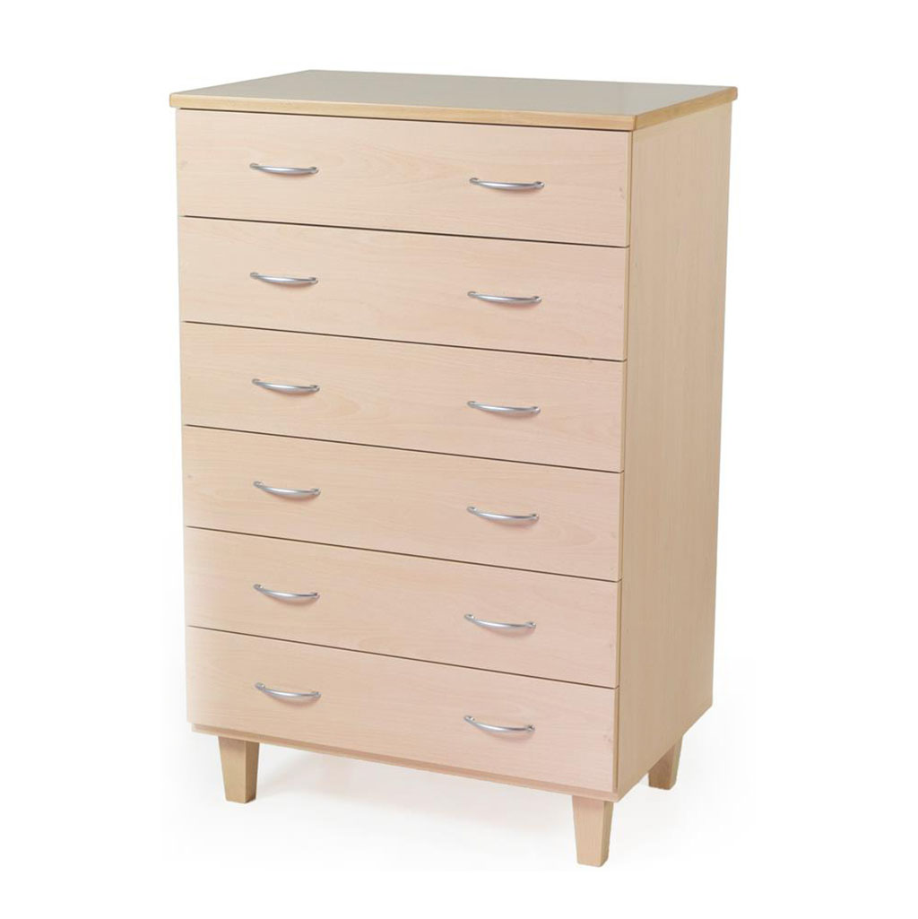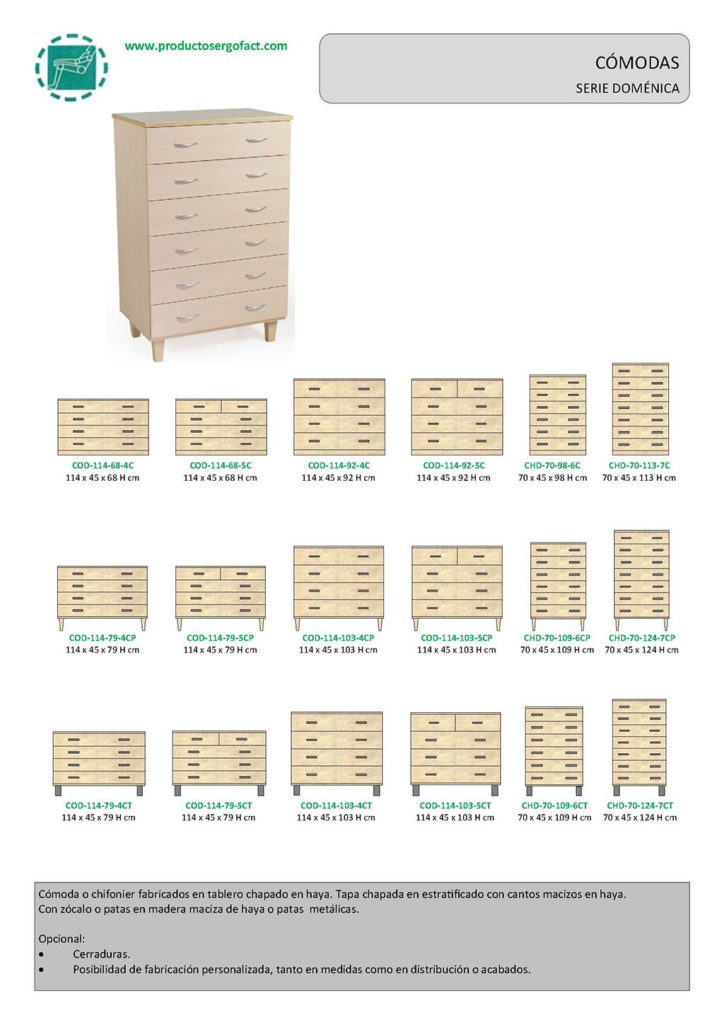 Cómoda o chifonier fabricados en tablero chapado en haya. Tapa chapada en estratificado con cantos macizos en haya.