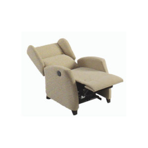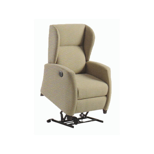 Sillón ergonómico orejero abatible y bipedestador, de accionamiento eléctrico mediante mando por cable. Respaldo y reposapiés independientes (el reposapiés se extrae en cualquiera que sea la posición del respaldo, lo que posibilita permanecer en posición de sentado con el reposapiés elevado). Con ruedas.