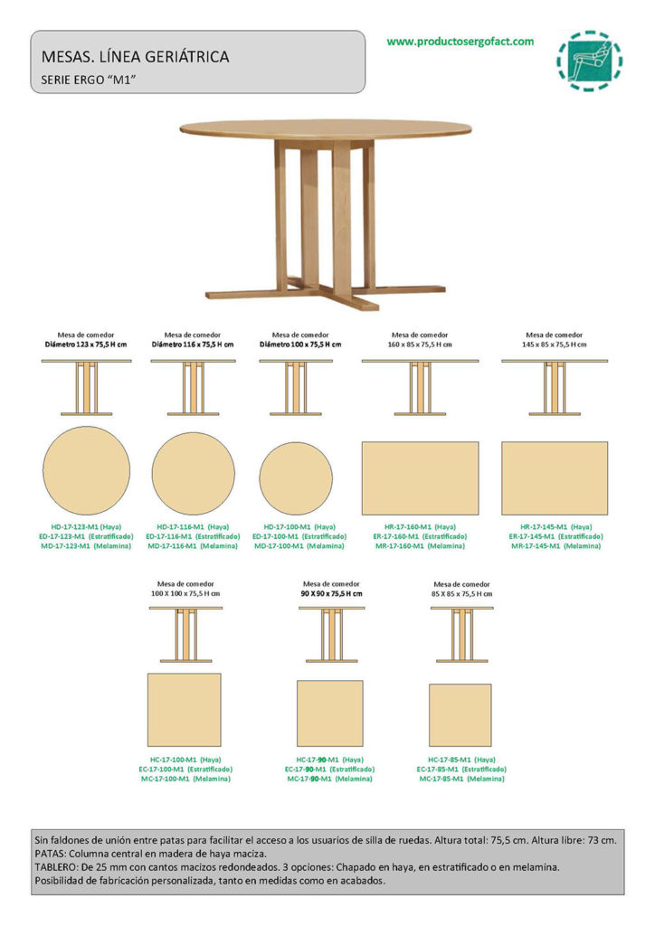 • Sin faldones de unión entre patas para facilitar el acceso a los usuarios de silla de ruedas. Altura total: 75,5 cm. Altura libre: 73 cm.