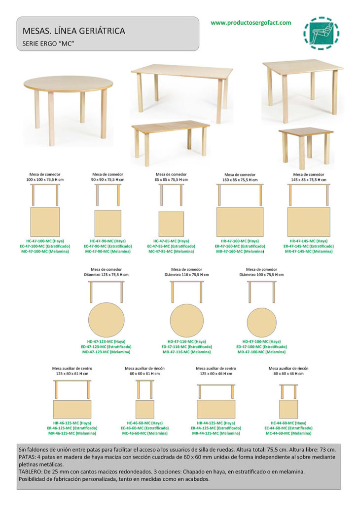 • Sin faldones de unión entre patas para facilitar el acceso a los usuarios de silla de ruedas. Altura total: 75,5 cm. Altura libre: 73 cm.