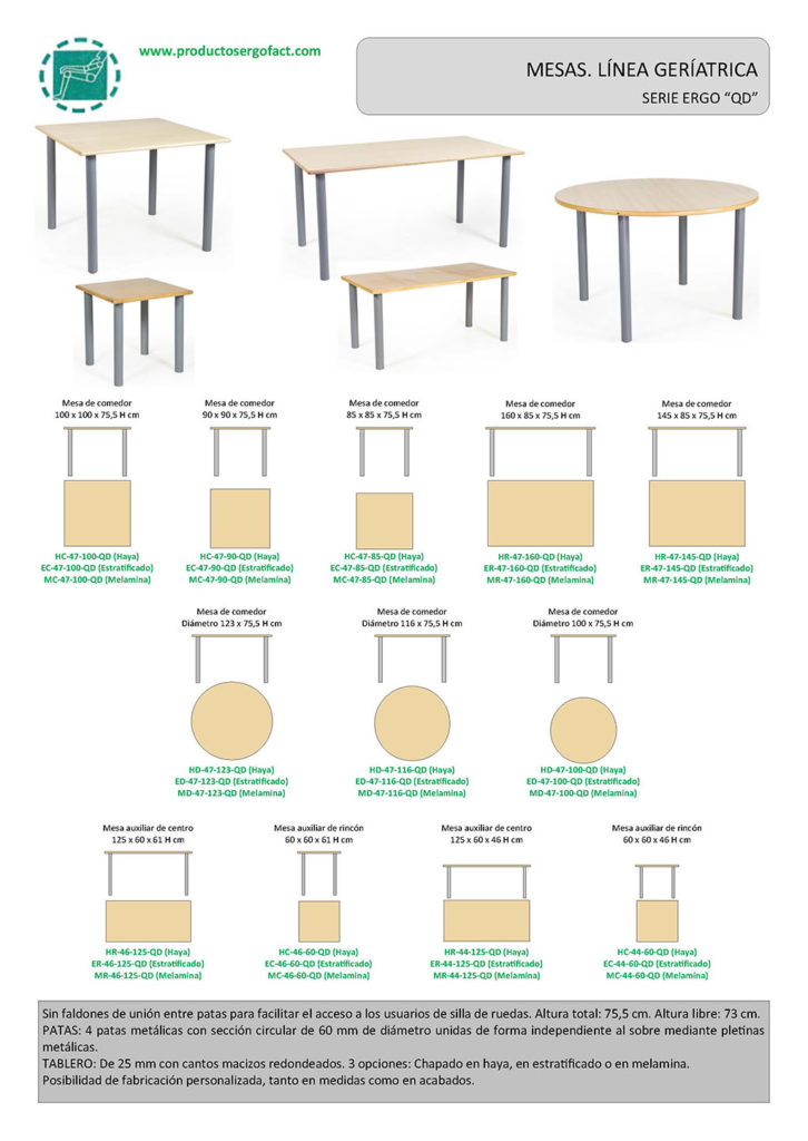 • Sin faldones de unión entre patas para facilitar el acceso a los usuarios de silla de ruedas. Altura total: 75,5 cm. Altura libre: 73 cm.