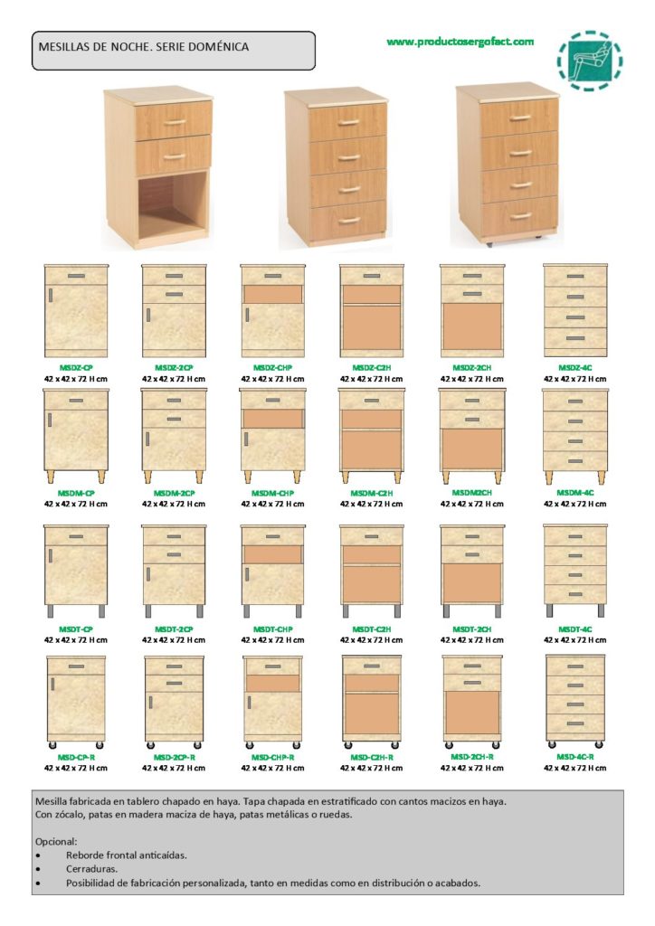 Con zócalo, patas en madera maciza de haya, patas metálicas o ruedas.