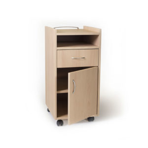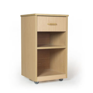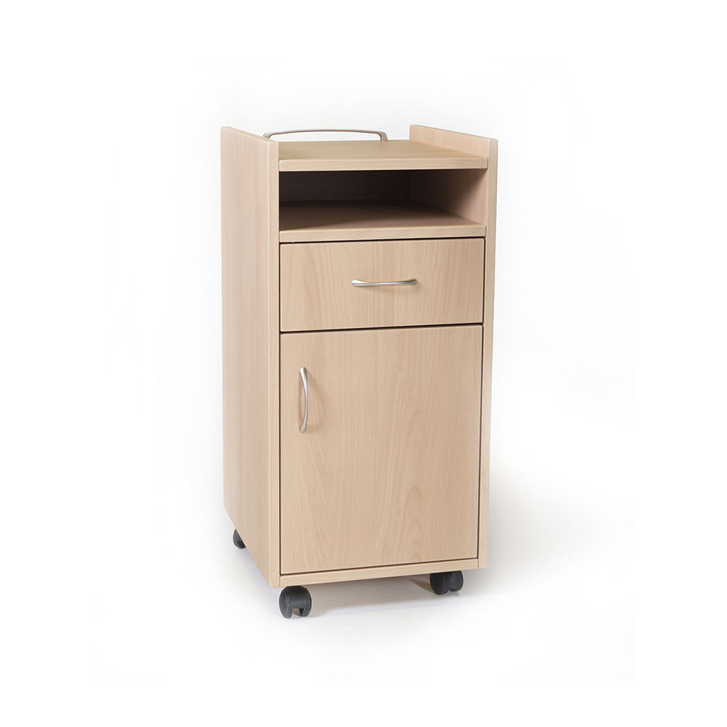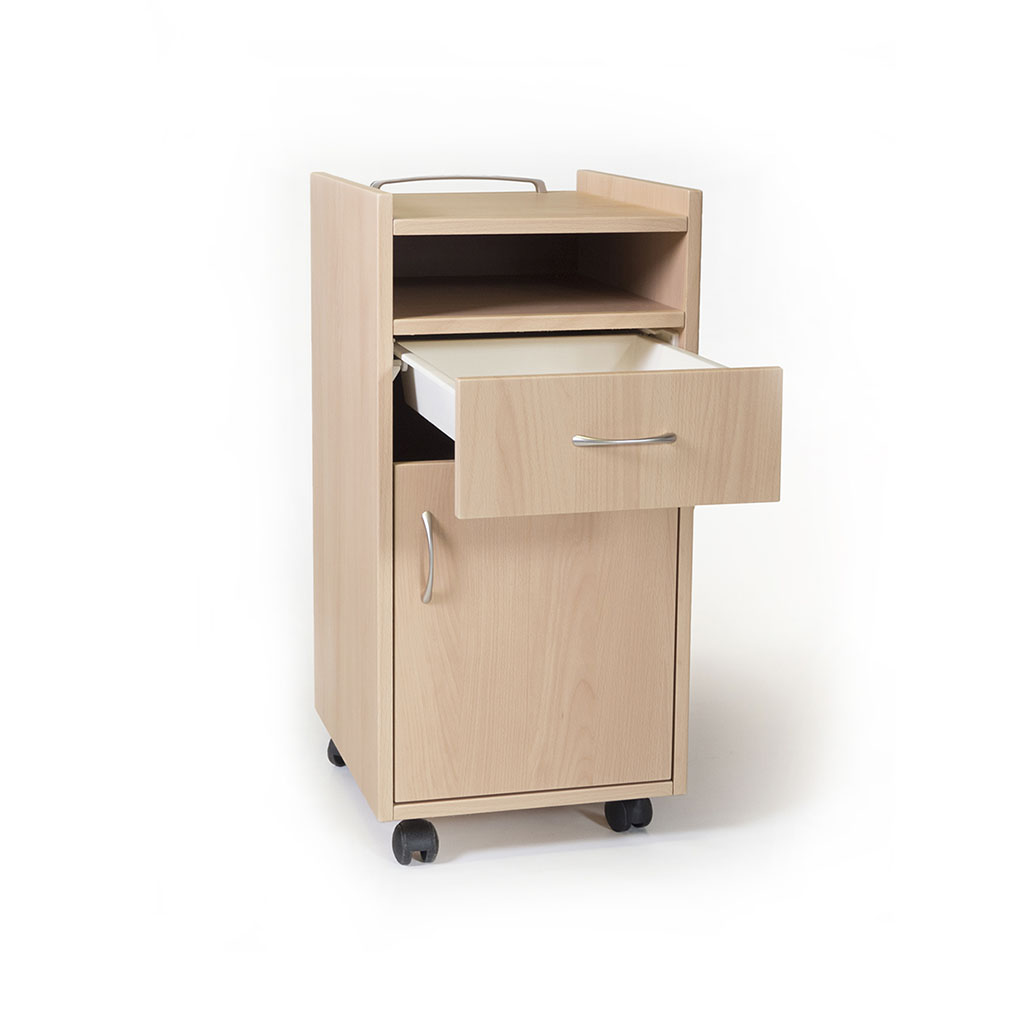 Mesilla fabricada en tablero chapado en haya. Tapa chapada en estratificado con cantos macizos en haya.